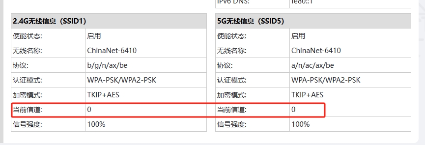 开启双频合一,web显示2.4G、5G当前信道为0.