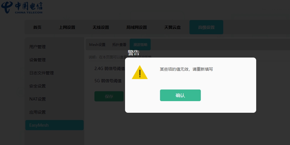 1、修改漫游阈值保存失败,提示:某些项的值无效,请重新填写