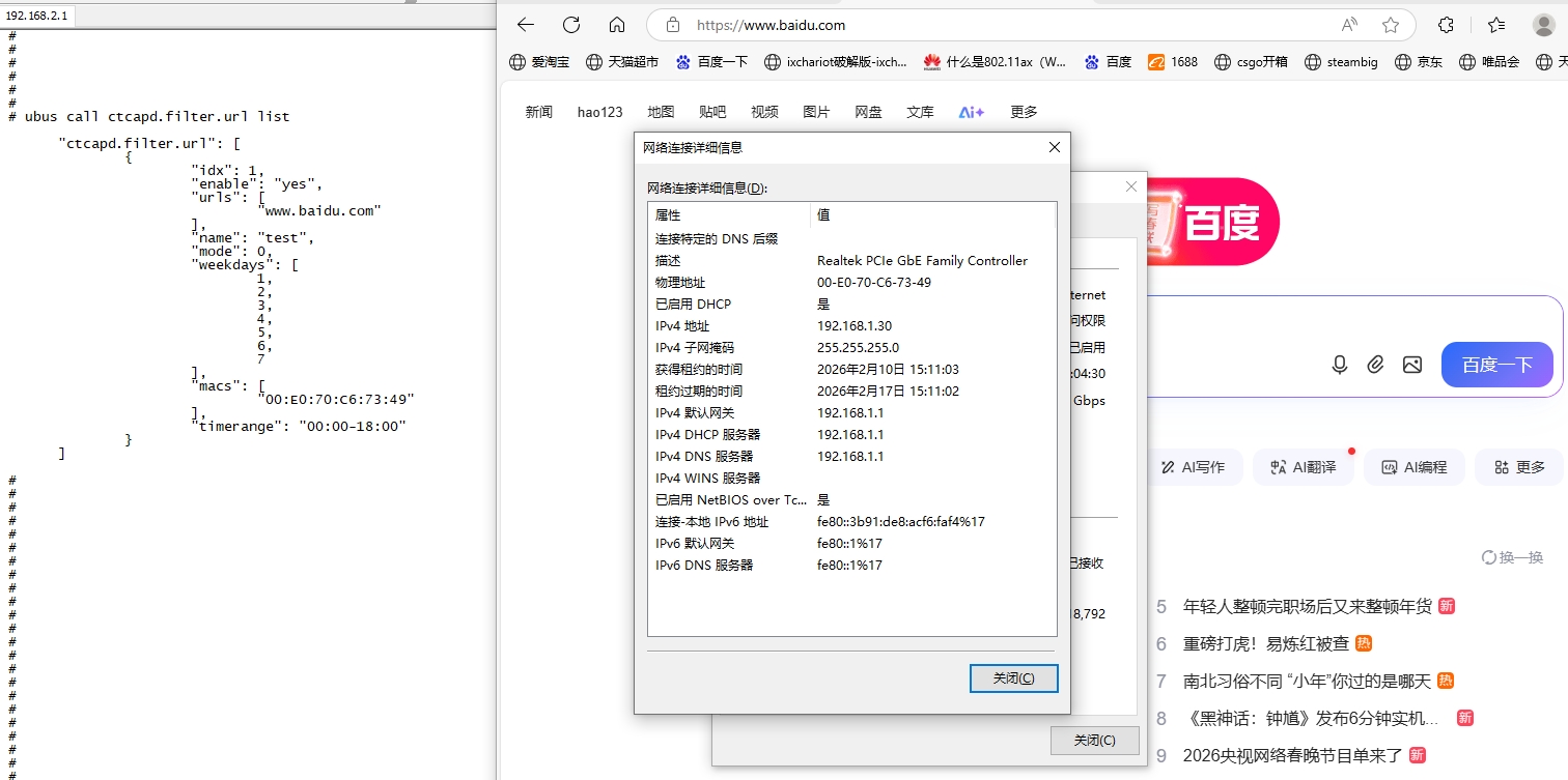 ubus命令添加url过滤成功,使用对应mac的STA设备浏览设置网址未限制。