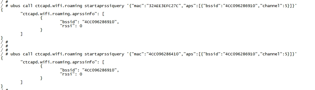 ubus call ctcapd.wifi.roaming startaprssiquery '{"mac":"32AEE3EFC27C","aps":[{"bssid":"4CC096286910","channel":5}]}'
