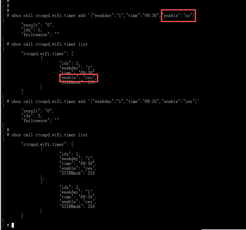 / # ubus call ctcapd.wifi.timer add '{"weekday":"1","time":"09:30","enable":"no"}'