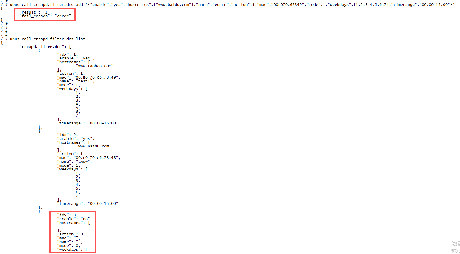 ubus call ctcapd.filter.dns add '{"enable":"yes","hostnames":["www.baidu.com"],"name":"test","action":1,"mac":"00E070C67349","mode":1,"weekdays":[1,2,3,4,5,6,7],"timerange":"00:00-15:00"}'